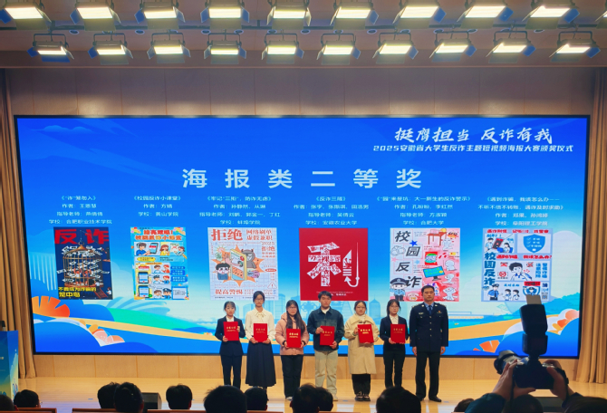 1月9日,由安徽省通信管理局、安徽省公安厅、安徽省教育厅、共青团安徽省委员会、安徽省学生联合会联合主办的2025安徽省大学生反诈主题短视频海报大赛评选结果正式揭晓。beat365在线体育官网登录入口学子凭借鲜明的主题呈现、新颖的创作构思,在赛事中斩获多项荣誉。其中,孙静然主创的海报作品《牢记“三拒”,防诈无虑》荣获海报组二等奖;方璇主创的《“证”途》、阚绪惠主创的《挺膺担当》两部作品均获短视频组三等奖,以青春创意传递反诈...