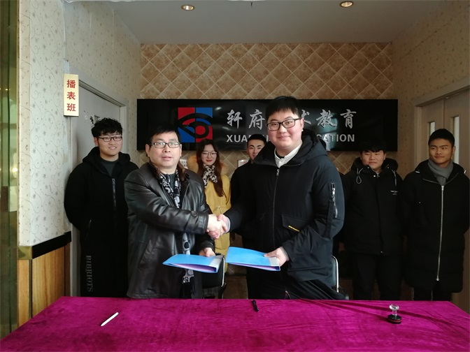 随后,文学与教育学院和轩府艺术教育双方签订了实践与就业基地协议;赵大为和殷泽旭共同为实践与就业基地挂牌。