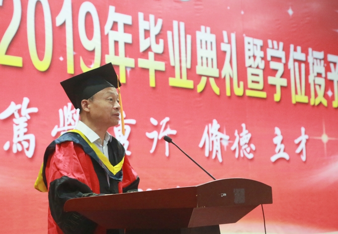 郑桂富在致辞中向顺利完成学业的全体毕业生表示最热烈的祝贺,向辛勤培育学生的老师们表示最衷心的感谢。对于即将走出校门,奔向广阔天地的同学们,他提出四点希望:一是希望他们做一个有家国情怀的人,在追逐个人梦想,实现人生价值的同时,涵养宏大格局,厚植家国情怀,强化责任担当;二是希望他们做一个勇于奋斗的人,耐得住寂寞,沉得下心气,从大事着眼,小事着手,一步一个脚印,把自己的路走实;三是希望他们做一个不忘学习的人,在工作中去学习,在社会中去学习,在更广阔的天地中去学习,披荆斩棘,一路前行;四是希望他们做一个有道德的人,守住自己的真诚和良知,守住自己的原则和底线,遵守社会公德,恪守职业道德,弘扬家庭美德,提升个人品德。最后郑桂富深情寄语,无论你们身在何处,母校都会永远牵挂你们、支持你们,母校永远是你们的心灵的港湾和精神的家园,祝愿全体毕业生前程似锦,生活幸福!