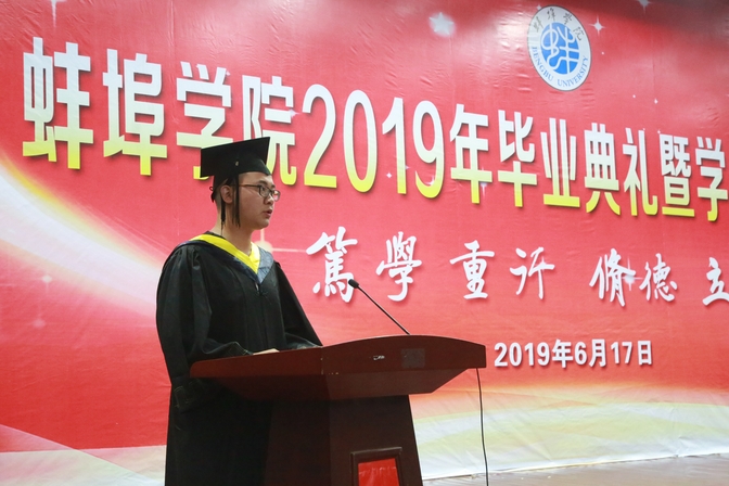 毕业典礼在雄壮的国歌声中拉开了序幕。毕业生代表、机械与车辆工程学院李乐深情表达了对大学青春时光的留恋和对恩师谆谆教诲的感激;教师代表、外国语学院党总支书记赵睿真诚寄语同学们要记住时不我待,要做有准备的人,要保持坦荡磊落。