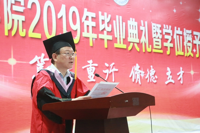 郭有强在主持典礼时希望毕业生们志存高远、直面挑战、脚踏实地、勇于奉献,真正把院长的殷切寄语和老师的谆谆教诲化作今后不断前行的动力,在充满希望的明天,书写人生最美的时间。他向同学们赠言:要把学习当习惯、要把诚信当实力、要把感恩当责任。毕业不是结束,而是新的开始;不是庆祝完成,而是宣布进步。无论你们走到哪里,无论毕业多少年,母校都会一直关注着你们,期望你们早日成为国家的栋梁,同时也欢迎大家常回家看看,关注母校的发展与成长。祝愿你们一路平安,前程灿烂!