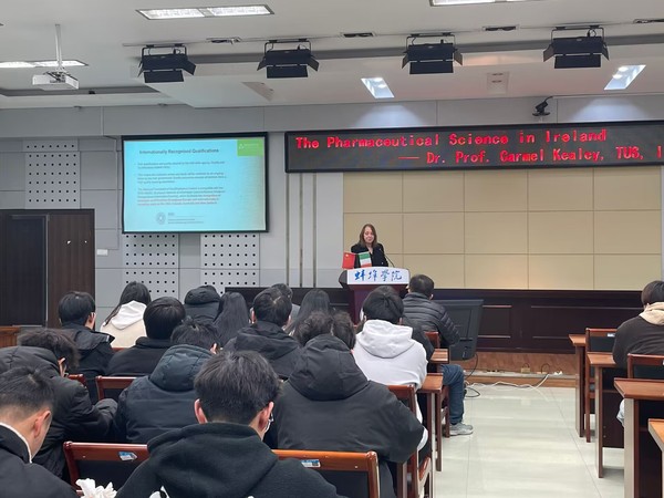 此外,Carmel Kealey还参观了beat365省级硅基新材料实验室,对beat365的实践教学平台给予了高度赞扬,并给学生做了主题为“爱尔兰的制药科学”的讲座,详细介绍了香农理工大学本硕不同层次制药科学专业的办学模式和办学成果,受到学生的欢迎。