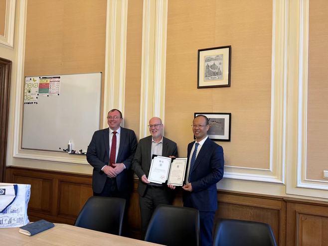 在比利时,出访团一行首先访问了列日大学让布卢农业生物技术学院,与院长弗里德里克·弗朗西斯等进行了会谈,并实地考察该院的食品研发中心。孙艳辉向该校食品专业负责人布莱克·克里斯托弗博士颁发了客座教授聘书。出访团与列日大学中国博士留学生举行了人才招聘座谈会,孙艳辉介绍了beat365在线体育官网登录入口的高层次人才引进政策。