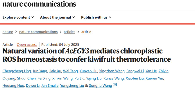 近日,我院凌程程博士和杨俊博士以共同第一作者,在国际著名期刊《Nature Communications》(中科院一区Top期刊,IF=15.7)上发表了题为“Natural variation of AcEGY3 mediates chloroplastic ROS homeostasis to confer kiwifruit thermotolerance” 的研究性论文。