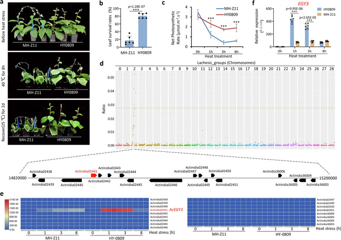 该研究揭示了猕猴桃物种中一个导致耐热性的自然变异。研究发现,耐热猕猴桃物种的AcEGY3基因表达量增加,该基因编码一种定位于叶绿体的蛋白质。该蛋白能够通过依赖于H2O2的逆行信号途径,促进细胞核耐热基因的表达。研究证明,AcEGY3基因启动子区域的自然变异形成了一个结合位点,用于结合热胁迫诱导的转录因子AcGATA1。AcEGY3表达量的增加受到AcGATA1及其与另一转录因子AcHSFA2-2可能存在的相互作用的调控。这种自然变异在热敏感猕猴桃物种中并不存在。综上所述,研究结果揭示了猕猴桃耐热性的遗传基础,并为培育耐热猕猴桃品种奠定了基础。(撰稿:杨俊;编辑:闫利萍、毛星懿;审核:马龙、王永斌、黄灿)