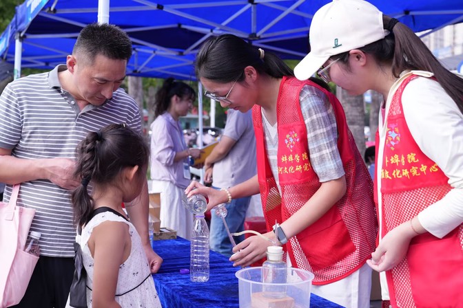 活动期间,淮河文化研究中心的展区吸引了大量市民与游客驻足。中心围绕“淮水安澜·文明传承·生态赋能”的展示思路,通过图文展板、实验体验、宣传讲解以及向来往市民发放淮河文化宣传材料等多种形式,生动展现了淮河流域悠久灿烂的历史文化、治水兴水的科技智慧以及鲜明的地域文化。