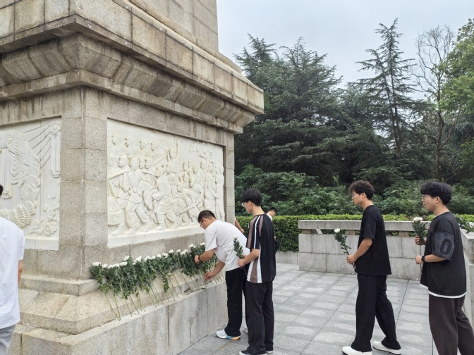 革命烈士纪念碑前,气氛庄严肃穆。陈宇润代表2025级新生团员发言,他表示“作为新时代的共青团员,我们要始终保持少年的赤诚、团员的责任和身为中国人的骄傲,在未来的学习和生活中,积极进取,用实际行动践行入团誓言”。随后,全体新生团员在纪念碑前庄严宣誓,重温入团誓词,回忆入团初心。最后,全体党员、团员肃立默哀,敬献鲜花,对革命先烈致以无限的哀思和崇高的敬意。