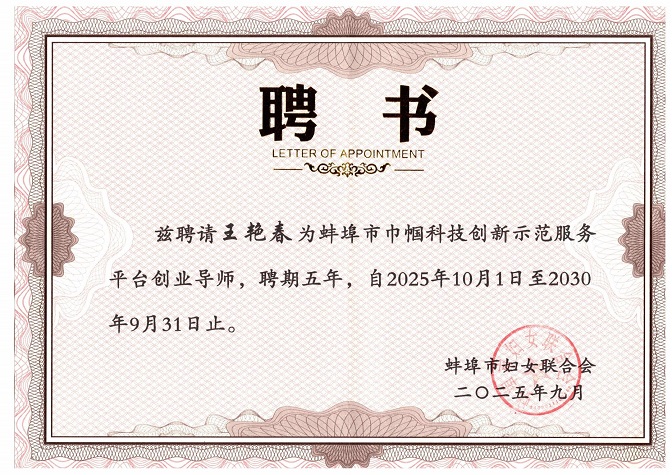 活动现场,王艳春参与巾帼科创平台揭牌,并被授予“蚌埠市巾帼科技创新示范服务平台创业导师”称号。这一身份既是对其教育科研成果与社会影响力的认可,也意味着她将以高校专家视角,为更多女性科技工作者和创业者提供精准指导,助力地方巾帼科创事业蓬勃发展。