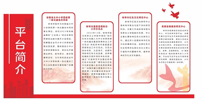 搭建特色科研平台:牵头承担“安徽省大中小学思政课一体化共同体”项目,统筹全省大中小学思政课一体化建设研究与实践;依托蚌埠市红色文化研究中心、美丽安徽建设研究中心,深耕区域特色研究领域;成功获批蚌埠市首届基层思想政治工作示范点,在习近平生态文明思想研究、红色文化传承两大领域形成特色优势,打造差异化科研品牌。