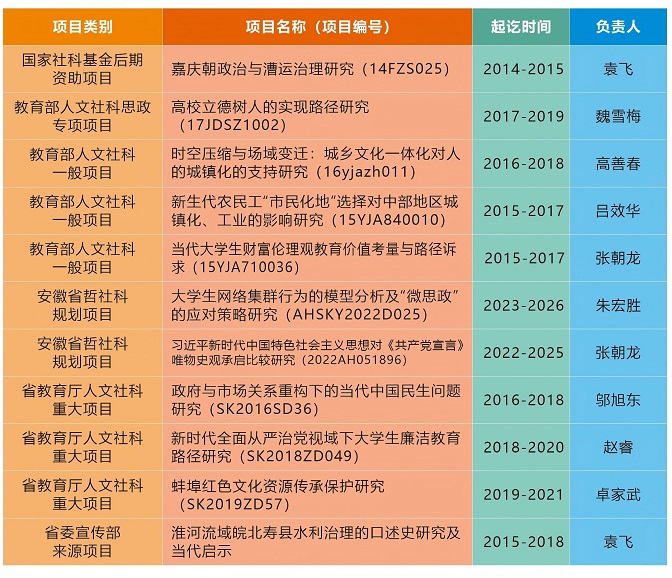 产出高水平科研成果:近年牵头承担国家级课题2项(国家社科基金后期资助项目)、部级课题4项(教育部人文社会科学研究项目)、省级课题30余项(安徽省社科规划项目及教育厅重大重点项目);在马克思主义理论、思政教育领域核心期刊发表CSSCI论文34篇;获安徽省“三项课题”一等奖1项、安徽省社会科学成果三等奖3项、蚌埠市社会科学成果一等奖若干,科研成果的学术价值与实践价值得到充分肯定。