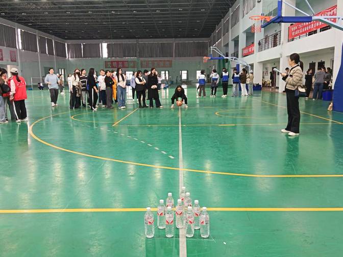 10月31日上午9时30分,趣味保龄球与定点投篮项目率先在室内运动场开赛。趣味保龄球赛场,参赛教职工们站在警戒线外,专注瞄准由10个饮料瓶组成的“球瓶阵”,以地滚球方式奋力投掷篮球。有的教职工精准发力,篮球滚动轨迹笔直,一举击倒多组瓶体;有的虽初次尝试,却也在调整姿势后渐入佳境,现场不时响起阵阵欢呼。