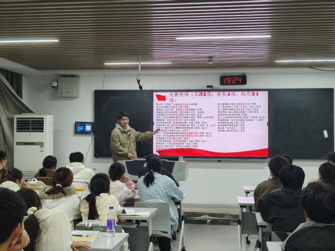 蒋光乐同学则以学科竞赛为核心,带来满满的实战经验分享。他曾带领团队参加省、校、院各级数十项赛事,经验颇丰。蒋光乐同学不仅分享了各学科竞赛的信息来源、组队技巧和参赛要点,还细致拆解了各项赛事的竞赛流程和评分细则,建议新生们搭配拥有实验操作、文案撰写、答辩展示不同特长的同学,鼓励大家尽早尝试,不惧失败,积累宝贵经验。