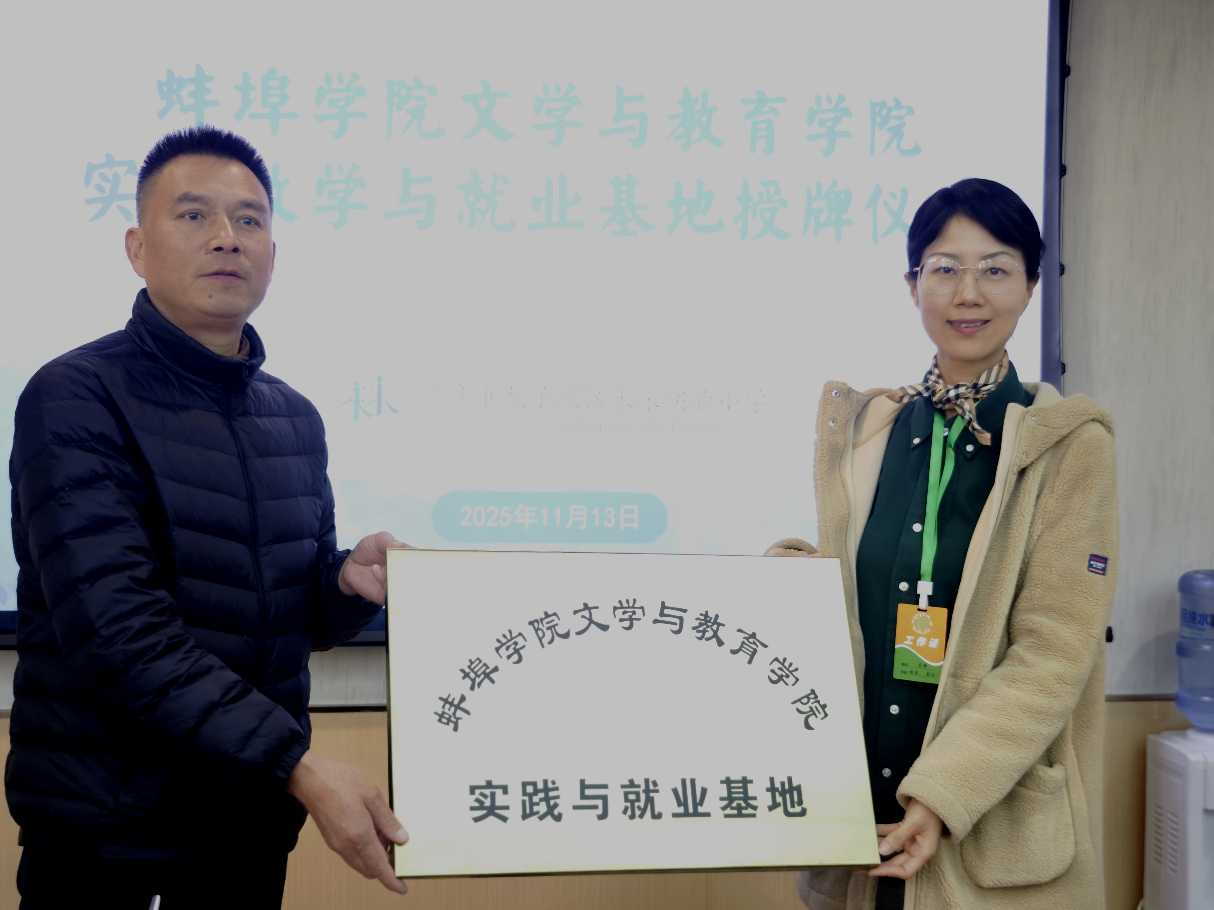 2025年11月13日,文学与教育学院院长吴长法、党委书记余建杰、党委副书记蒋晟、小学教育专业负责人周颖、党务秘书董琬如等人赴蚌埠市龙子湖区未来实验小学,共同举行了实践教学与就业基地协议书签订暨授牌仪式。蚌埠市龙子湖区未来实验小学党支部书记、校长尤静和党支部副书记、副校长施进楠等学校领导班子成员出席。