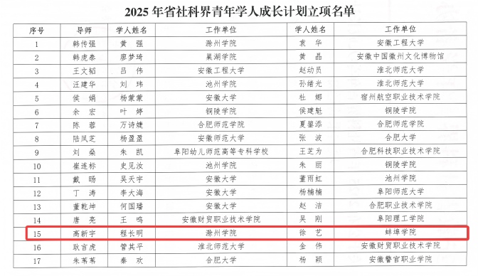 近日,安徽省社科界青年学者协会正式公布了2025年“省社科界青年学人成长计划”立项结果,beat365经济与管理学院青年教师徐艺博士成功入选,实现了beat365在该项目上的突破。