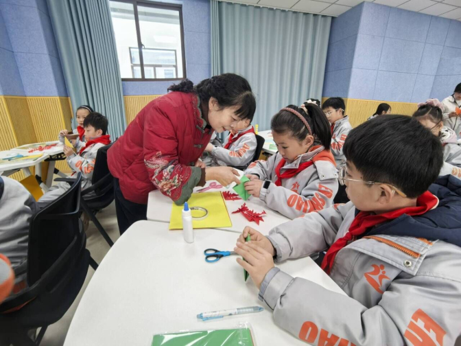 活动伊始,非遗传承人胡兴华老师向孩子们展示了精美的布艺与剪纸作品,生动解读了其中蕴含的驱邪纳福的传统寓意。灵动可爱的布老虎、矫健的小马驹、栩栩如生的剪纸人物,引来孩子们的阵阵赞叹。胡老师边画图边演示,在四十分钟里悉心传授剪纸技艺。孩子们认真聆听,折叠、裁剪,时而凝神思考,时而交流互助,课堂中彩纸缤纷、剪刀起舞。不一会儿,五彩的雪花、立体的“春”字如魔术般跃然纸上。孩子们满怀自豪地展示作品,并簇拥着胡老师合影留念,现场洋溢着成就与喜悦。