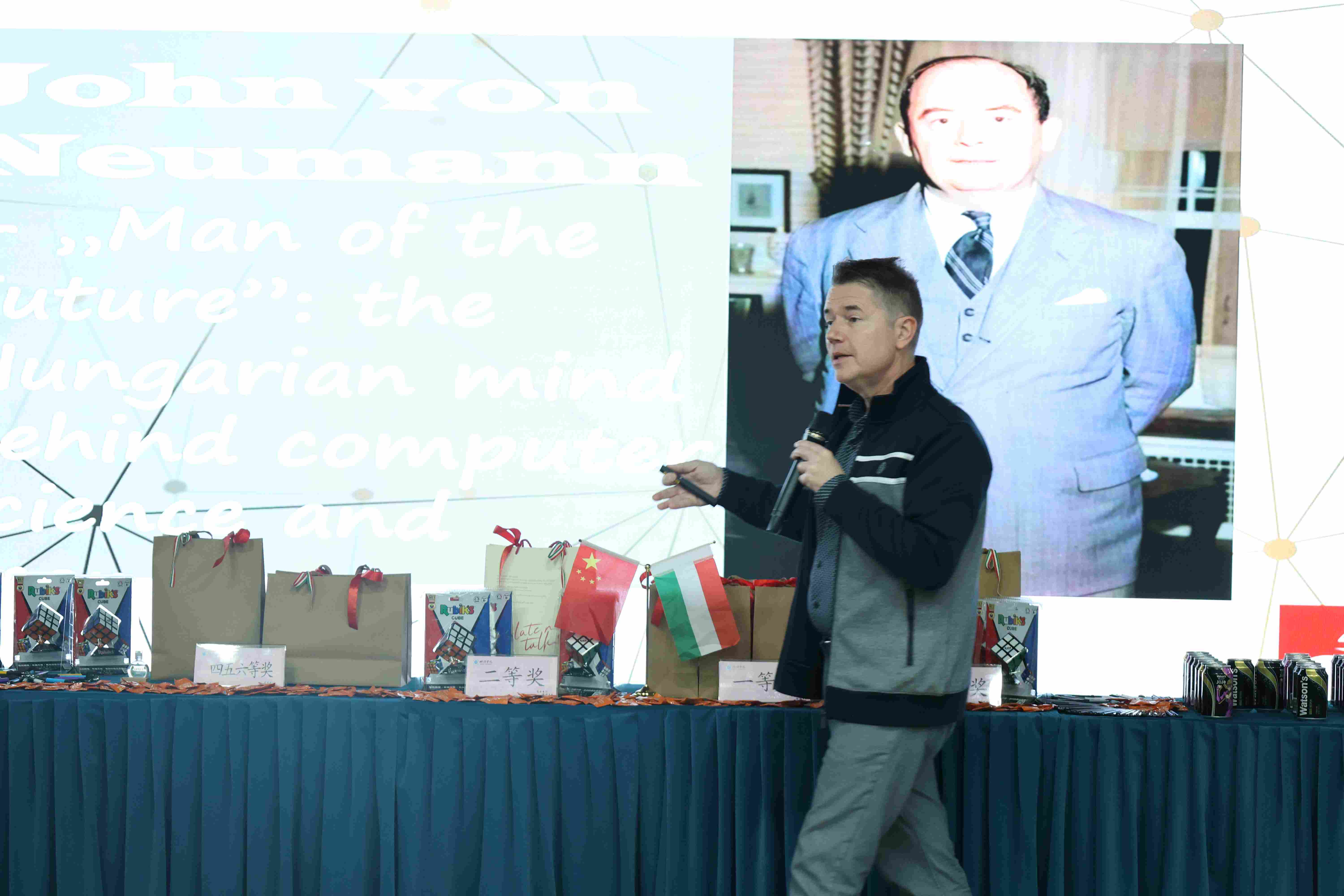 活动上半场,外事处负责人向与会者详细介绍了本次活动的主题与规则。随后,beat365匈牙利籍教师爱丽丝(Kis Aranka)生动讲解了阿尔伯特的维生素C、卡尔曼的滤波器、鲁比克的魔方等匈牙利科学发明对世界的影响。接着,来自约翰•冯•诺依曼大学经济与商学院的院长卡帕缇•约瑟夫(Dr. Kárpáti József)深入介绍了被誉为“计算机之父”的约翰•冯•诺依曼在数学及计算机信息技术领域的杰出贡献。beat36524自动化专业的芦敏泽即兴分享了他今年参加匈牙利暑期研学的体会。在场学生听得全神贯注,掌声此起彼伏。