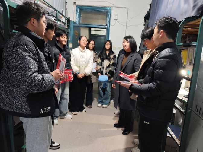 12月16日下午,学院党委书记哈焱、党委副书记马程与辅导员们一同走进学生寝室,将一份份精心准备的礼包亲手递到考研同学手中。每到一间宿舍,书记都与同学们亲切交流,细致询问大家的复习进度、生活状况与心理状态,叮嘱同学们在冲刺阶段要科学规划、劳逸结合,保持平稳心态,同时注意防寒保暖和身体健康。“学院永远是大家最坚实的后盾,有什么困难和需求随时提出来。”暖心的话语和实实在在的关怀,让寝室内洋溢着温暖与感动。同学们纷纷表示,这份突如其来的惊喜不仅带来了实用的文具,更给予了他们莫大的精神鼓舞。