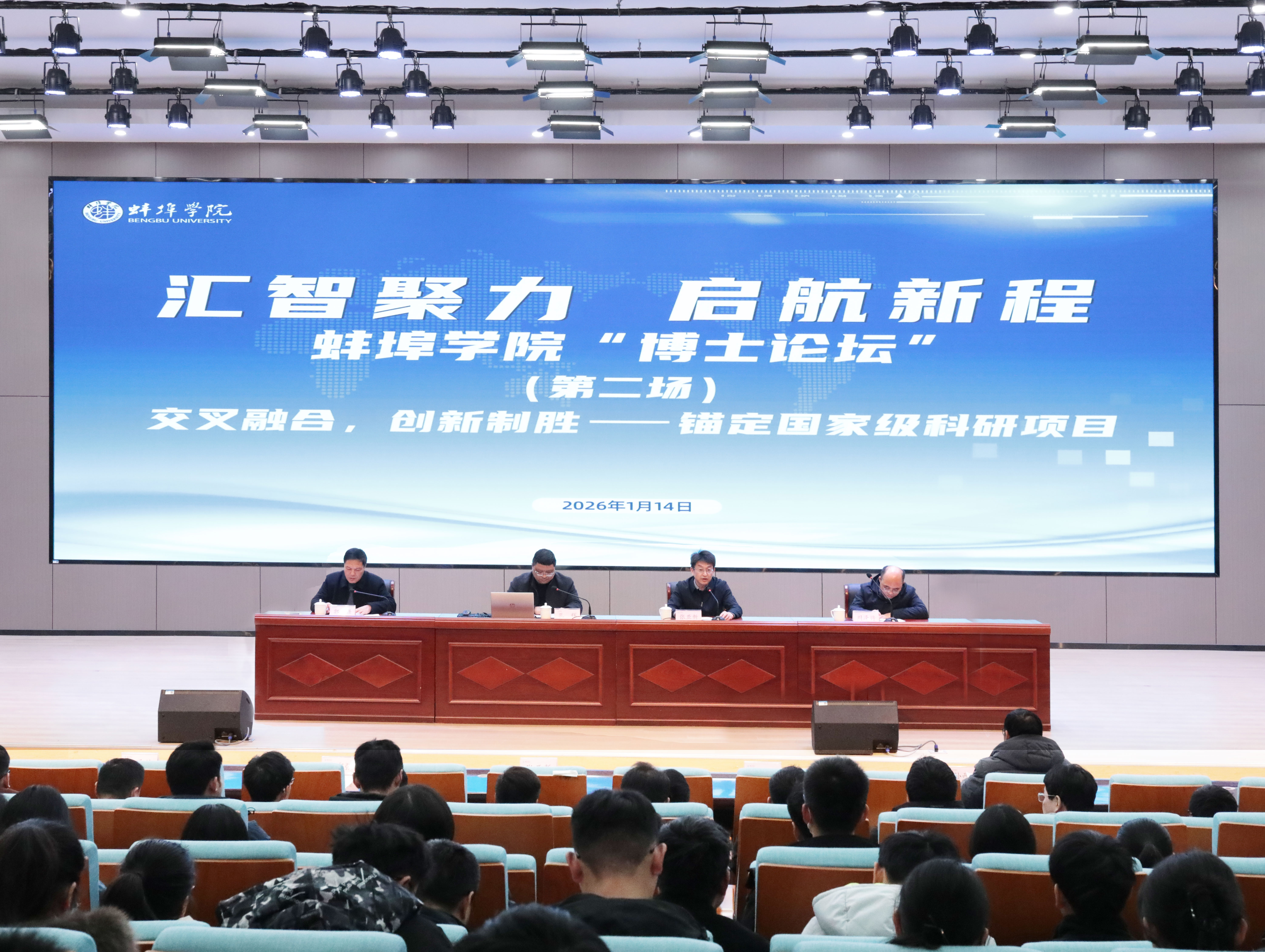 1月14日下午,beat365在线体育官网登录入口“博士论坛”第二场活动在图书馆学术报告厅顺利举行。本次论坛以“交叉融合,创新制胜——锚定国家级科研项目”为主题,特邀安徽工业大学教务处处长孔辉教授与安徽大学商学院院长周泽将教授作专题报告。校长张亚新出席活动并致辞,副校长郭有强主持活动。科研处、各二级学院(部)负责人、学科骨干教师及近五年新进博士教师参加了本次活动。