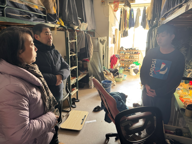 走访过程中,慰问组一行细致查看了各宿舍的防寒保暖、用电安全及卫生状况,并与同学们进行了亲切深入的交流。哈焱详细询问了每位留校学生的具体原因、生活安排、学业进展及面临的实际困难。他特别强调,安全是底线,提醒同学们务必注意极端天气下的出行安全、宿舍用电规范及个人健康防护;同时鼓励大家合理规划假期时间,在保障休息的前提下,充分利用学校资源,稳步推进科研任务、学业复习或实习实践,实现假期期间的自我提升。慰问组还现场协调解决了同学们反映的部分生活不便问题,并明确表示,学院将建立寒假留校学生动态联络机制,确保信息畅通,提供及时必要的支持,包括但不限于学习资源对接、生活便利协调与应急援助。