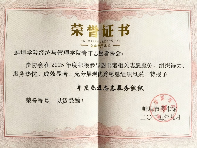 经济与管理学院青年志愿者协会日前从蚌埠市图书馆捧回“年度先进志愿服务组织”荣誉证书,这一沉甸甸的奖项,是对该协会2025年度在图书馆志愿服务领域深耕细作的最高奖,更是其长期践行志愿精神、传递社会温暖的有力证明。回溯2025年的志愿服务征程,经济与管理学院青年志愿者协会的志愿者们在图书馆的各个角落留下了无数动人的身影,他们以“组织得力”为保障,建立起规范的志愿服务调度机制,确保每一次服务衔接有序;以“服务热忱为内核,用真诚的微笑和专业的素养为读者解答疑惑、整理书籍,让图书馆的每一处空间都充满人文温度;以“成效显著”为成果,通过系列志愿服务,有效提升了图书馆的服务效率,也让读者的阅读体验更顺畅、求知过程更加安心。无数个周末与课余时间,他们用行动诠释着“奉献、友爱、互助、进步”的志愿精神,成为图书馆里一道亮丽的青春风景线。这份荣誉是里程碑,更是新起点。经济与管理学院青年志愿者协会将以此为契机,继续深耕志愿服务领域,不断拓展服务边界、提升服务质量,带动更多青年学子加入志愿行列,让公益的火种在更多领域燎原,以青春之我、奋斗之我,为社会文明建设注入源源不断的志愿动能。(撰稿:王皖龙;编辑:季园园;