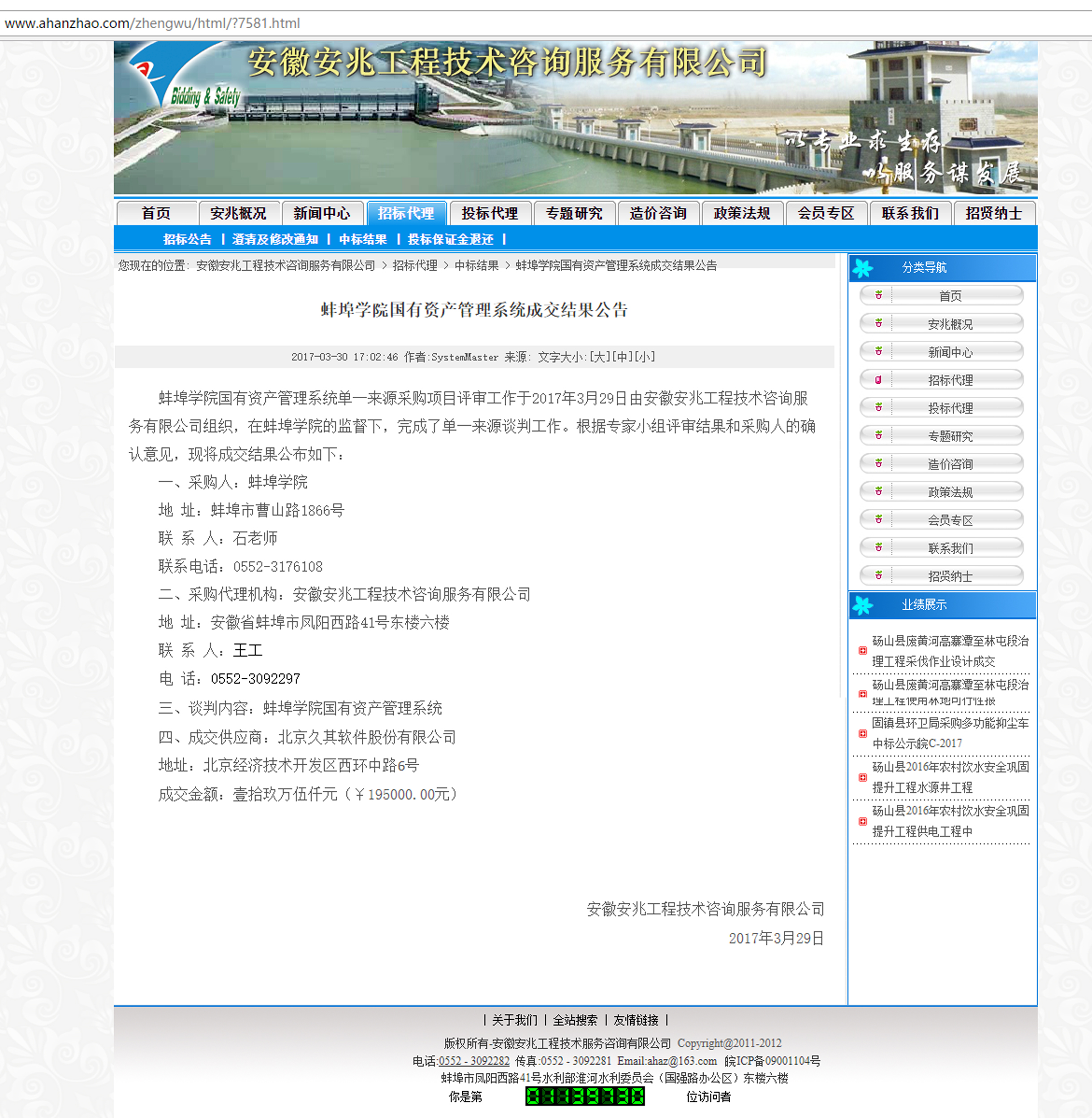 beat365在线体育官网登录入口国有资产管理系统单一来源采购项目评审工作于2017年3月29日由安徽安兆工程技术咨询服务有限公司组织,在beat365在线体育官网登录入口的监督下,完成了单一来源谈判工作。根据专家小组评审结果和采购人的确认意见,现将成交结果公布如下:一、采购人:beat365在线体育官网登录入口地址:蚌埠市曹山路1866号联系人:石老师联系电话:0552-3176108二、采购代理机构:安徽安兆工程技术咨询服务有限公司地址:安徽省蚌埠市凤阳西路41号东楼六