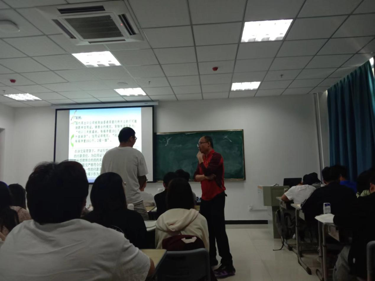2022年5月4日上午第2节在M303教室,国际经济与贸易教研室组织听评盛志鹏副教授讲授的《国际结算》课,杨国才院长、潘锦云处长、黄先军副院长、张毅芳副教授、刘鹏飞副教授及国际经济与贸易教研室全体教师参与了听课。盛志鹏首先简要回顾了上节课的主要内容,然后借助案例,引入新课内容,他通过图片、案例、提问、讨论等方式向同学们讲授了信用证的含义与特征、信用证当事人的权利与义务等内容。