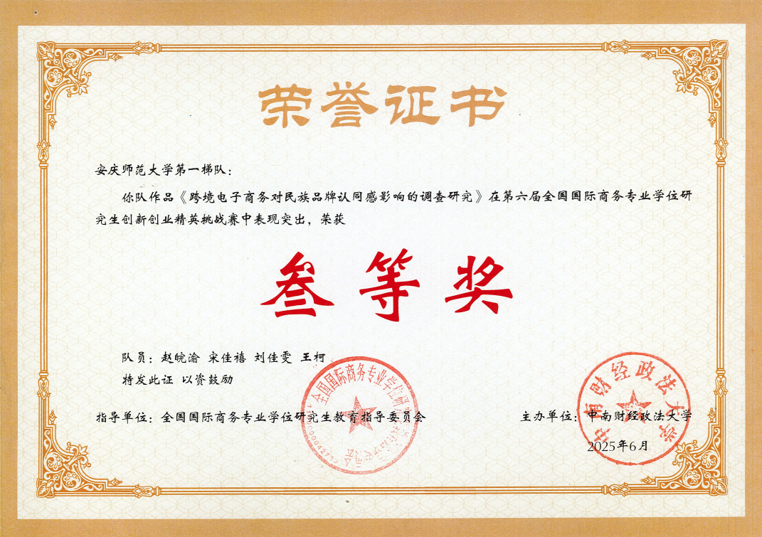 近日,第六届全国国际商务专业学位研究生创新创业精英挑战赛落下帷幕,由研究生赵皖渝、宋佳禧、刘佳雯、王柯组成的“第一梯队”,在九游官网余卫老师的指导下荣获全国三等奖,余卫博士荣获“优秀指导教师奖”。