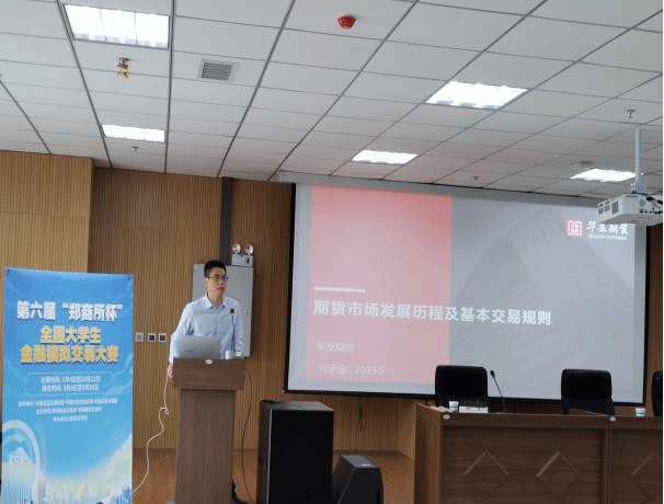 2023年5月24日,在学院112报告厅,九游官网金融工程教研室师生与华安期货安庆营业部共同演绎,开展了一场精彩的专业实践教学活动。参加此次活动的有华安期货安庆营业部总经理何承金、营销总监张浩、业务顾问胡翔以及学院金融工程专业师生,一百余人共聚一堂,以郑州商品交易所为讨论对象,让同学们深入了解到国内外期货市场发展历程及其基本交易规则,并以此激发同学们对与此相关专业赛事的兴趣,达到以赛促学的目的。