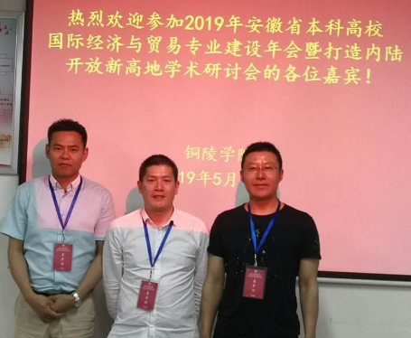 2019年5月25日,2019年安徽省本科高校国际经济与贸易专业建设年会暨打造内陆开放新高地学术研讨会在铜陵召开,本次研讨会由铜陵学院承办,省内外高校经管学院国贸专业教师共50余人参会。九游官网潘锦云教授、王洪国博士、盛志鹏副教授、殷功利博士应邀参加了会议,会议分两部分。