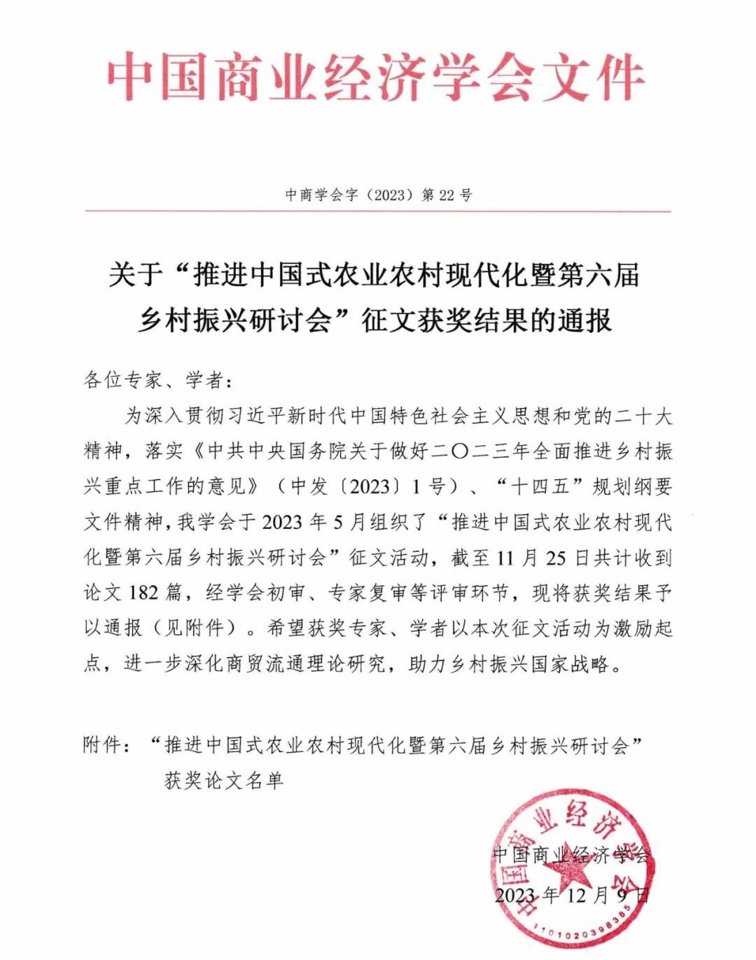 近日,中国商业经济学会公布了“推进中国式农业农村现代化暨第六届乡村振兴研讨会”征文获奖名单,九游官网研究生校外导师汪传华以学校为第一单位,投稿的论文《乡村振兴与乡村治理研究——以安徽省潜山市天柱山镇河西村为例》喜获三等奖。该征文活动共计收到182篇参评论文,经学会初审、专家复审等环节,最终评选出10篇一等奖论文、20篇二等奖论文、33篇三等奖论文。(撰稿 供图:余卫 审核:徐俊杰)