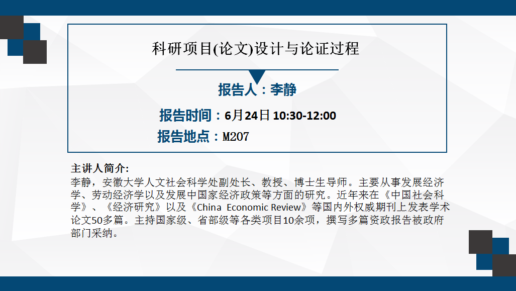 6月24日上午,应学院邀请,安徽大学李静教授、博士生导师为九游官网师生作题为“科研论文(项目)设计及其论证过程”的学术报告,报告会由九游体育官网副院长黄先军教授主持,学院部分教师与研究生参加了会议。