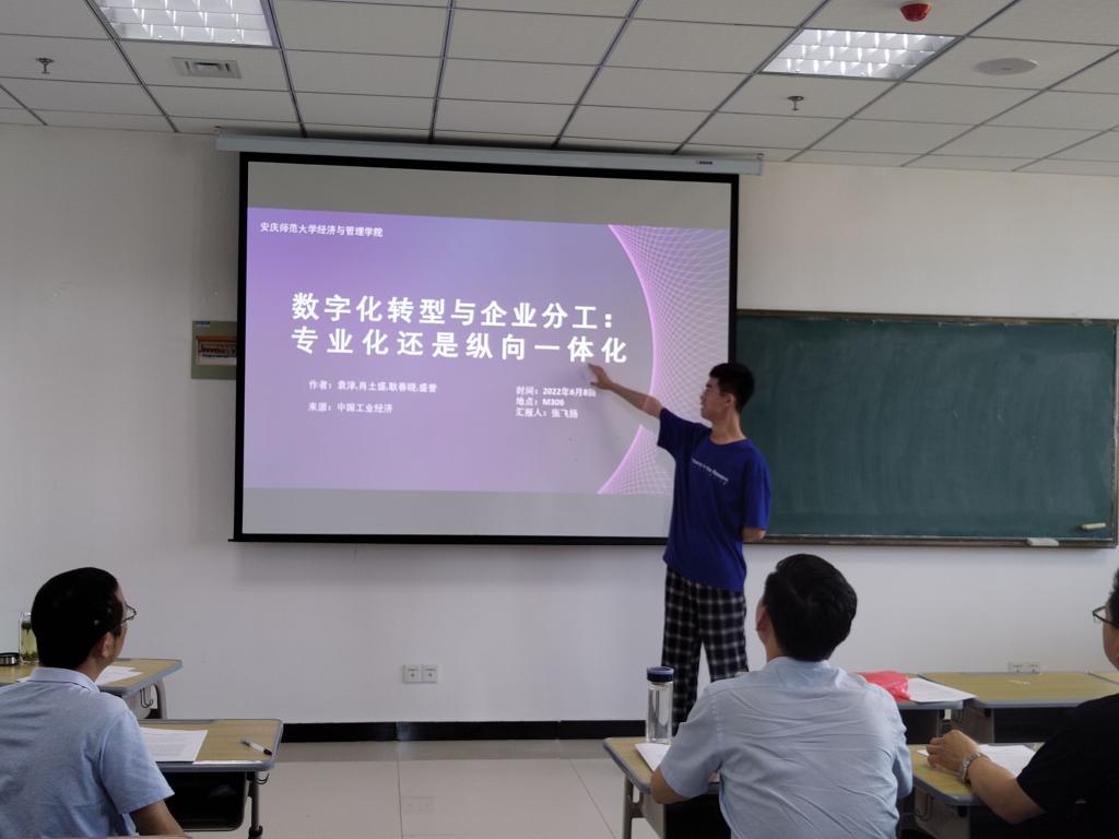 会议伊始,本院研究生张飞扬和童珍光同学汇报了国内经济学顶级期刊近期发表的两篇数字经济专题文献。与会老师与研究生一起,对文献中的理论框架、实证策略、变量设定和度量方法等进行了仔细研读和深入探讨,并对文献中的逻辑框架和技术细节等提出各自的观点和看法。随后,彭长生教授就下一步科研活动开展的具体内容和形式,以及围绕数字经济和产业结构与就业结构失衡等相关论文选题,与参会老师进行了充分地交流和研讨。