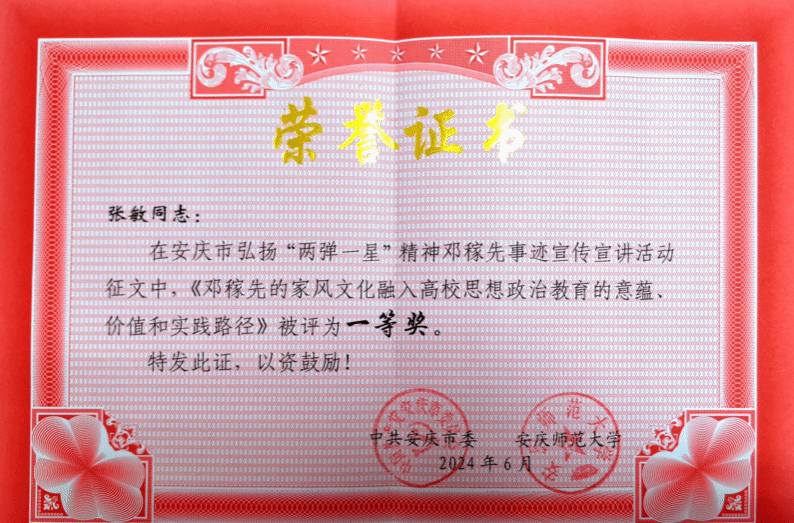近日,中共安庆市委公布了“安庆市弘扬‘两弹一星’精神邓稼先事迹宣传宣讲活动征文”获奖名单,九游官网教师张敏投稿的论文《邓稼先的家风文化融入高校思想政治教育的意蕴、价值与实践路径》喜获一等奖。该征文活动共计收到183篇参评论文,经初审、复审等环节,最终评选出6篇一等奖论文、10篇二等奖论文、14篇三等奖论文。(撰稿 供图:张敏 审核:徐俊杰)