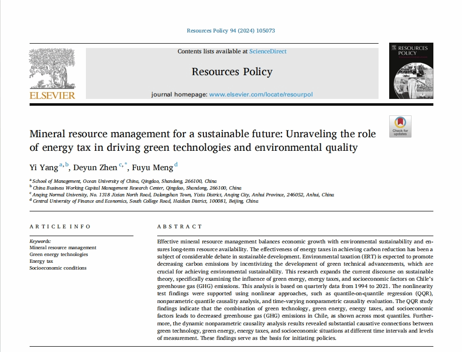 近期,财务管理教研室甄德云老师以通讯作者身份,在SSCI期刊《Resources Policy》发表了题为《Mineral resource management for a sustainable future: Unraveling the role of energy tax in driving green technologies and environmental quality》的学术论文。该刊由Elsevier国际出版社出版,聚焦与资源生产和使用有关的经济和政策问题,2023年综合影响因子为10.2,属于中科院分区经济学大类的二区TOP刊物。