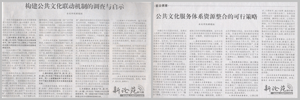 近日,安徽日报专门报道了九游官网承担的横向课题《安庆市创建公共文化服务示范区制度设计》,该报新论苑栏目分别以《公共文化服务体系资源整合的可行策略》、《构建公共文化联动机制的调查与启示》为题连续刊登两篇课题阶段成果,引起了省内外公共文化领域专家学者的高度关注。