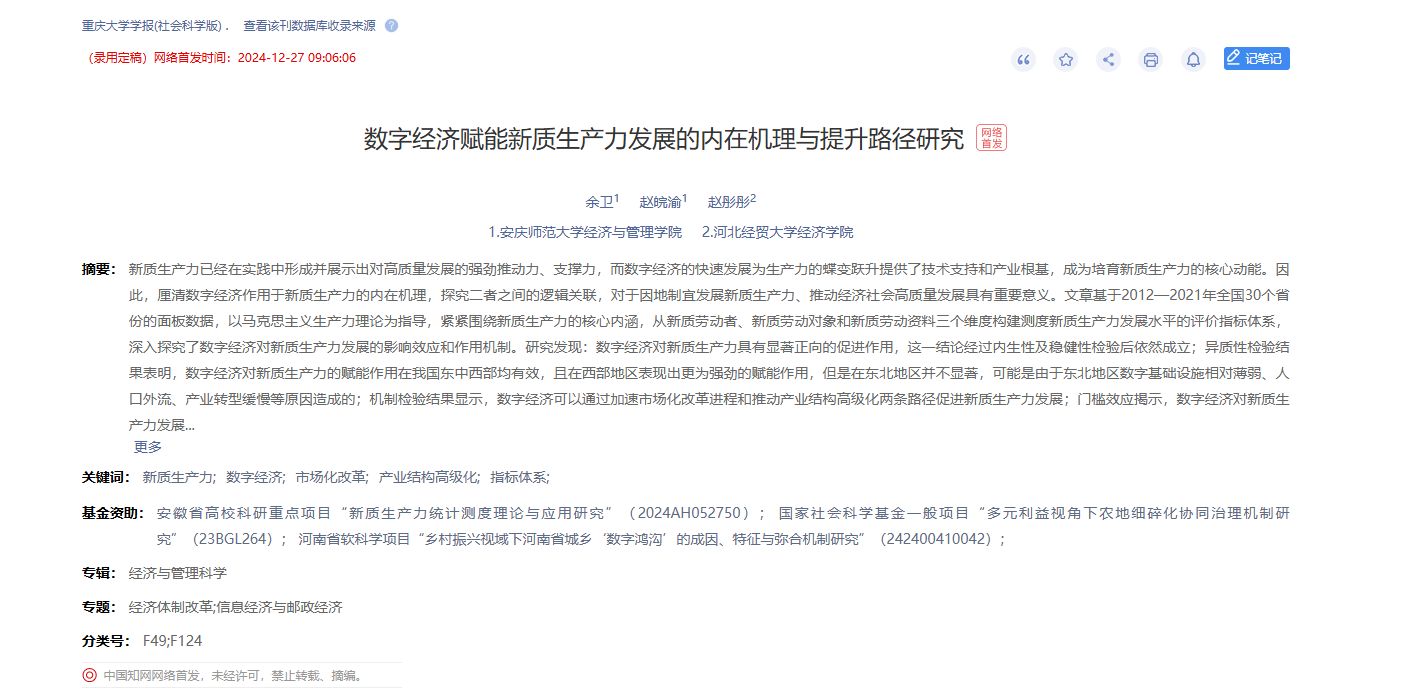 近日,市场营销教研室余卫博士为第一作者的论文《数字经济赋能新质生产力发展的内在机理与提升路径研究》,在《重庆大学学报(社会科学版)》网络首发。