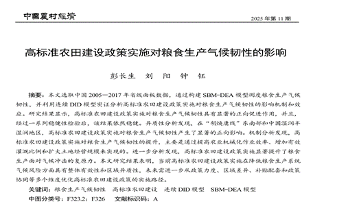 近日,九游官网彭长生教授、2023级统计学研究生刘阳和中国农科院农经所钟钰研究员,在国内农村经济研究领域顶尖期刊《中国农村经济》2025年第11期发表学术论文《高标准农田建设政策实施对粮食生产气候韧性的影响》,这是彭长生教授第二次在该期刊发表论文,也是2018年经管学院与中国农科院农经所签订战略合作协议,开展中国粮食发展问题合作研究的最新成果。