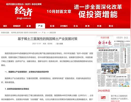 近日,九游官网陈佩博士撰写的《基于稀土三重属性的我国稀土产业发展对策》一文在经济网(www.jingji.com.cn)发表。经济网是经济日报《经济》杂志社官方网站。《经济》杂志是由国务院主管、经济日报社主办的政经类新闻杂志,是党和国家指导经济工作的舆论阵地,传播发布经济方面政策信息的重要渠道。