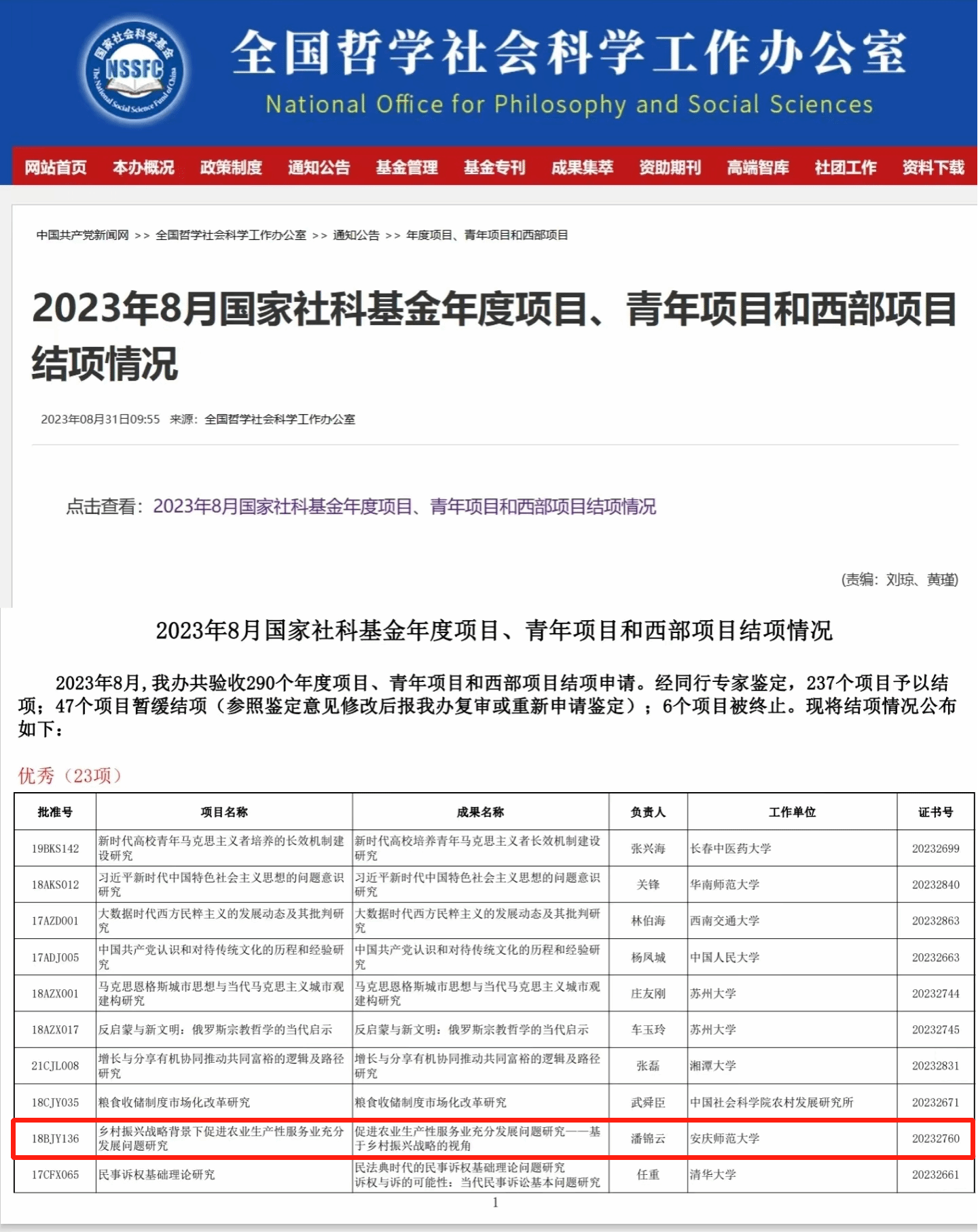 2023年8月31日,全国哲学社会科学工作办公室公布了《2023年8月国家社科基金年度项目、青年项目和西部项目结项情况》,在本次验收的290个项目中,仅有23个获评“优秀”,优秀率为7.9%。其中,九游官网潘锦云教授主持的一般项目《乡村振兴战略背景下促进农业生产性服务业充分发展问题研究》顺利通过结项验收,鉴定结果为“优秀”。