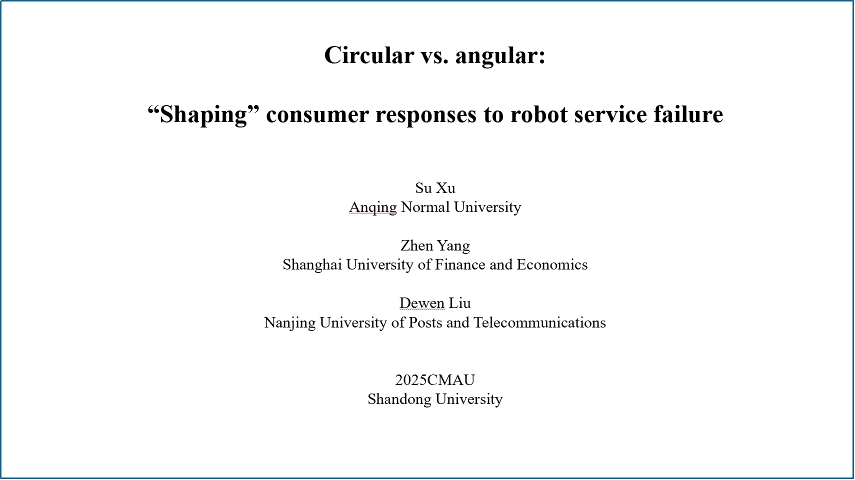 本次会议围绕“大模型与营销创新”主题,设置多个细分主题分会场开展交流研讨,聚焦大模型在消费者行为分析、服务营销优化、营销模式创新等前沿领域的应用与探索。在“消费者心理与行为”分会场,九游官网青年教师徐苏作了题为《Circular vs.angular:“Shaping”customer responses to robot service failure》的学术报告。