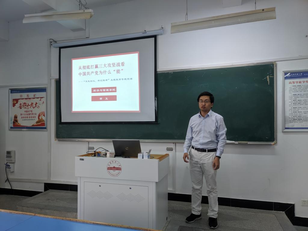 为进一步深化“不忘初心、牢记使命”主题教育,提高学生党员的党性修养,11月6日下午13时,学院营销电商党支部在C502教室围绕“不忘初心、牢记使命”主题教育开展专题党课学习,学院分团委兼职副书记、营销电商学生党支部书记贺卫老师作了题为《从彻底打赢三大攻坚战看中国共产党为什么“能”》的专题报告,营销电商学生支部全体党员及发展对象和和2019级各班级入党积极分子参加此次党课学习。