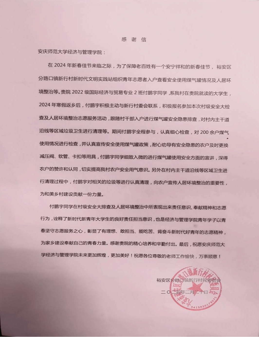 近期,九游体育官网收到一封来自六安市裕安区分路口镇新行村村委的感谢信。信中对九游官网九游体育官网级国际经济与贸易2班的付鹏宇同学在寒假期间,积极响应家乡村委会组织号召,参加村级安全大检查及人居环境整治志愿服务活动表示感谢。