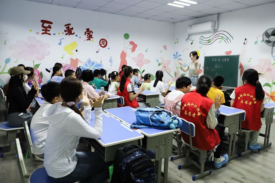 “小朋友们,来跟着老师一起唱。”“儿童节,是六一,小朋友们真欢喜……”老师正在教孩子们唱一首新的歌谣。在志愿者的陪伴和帮助下,孩子们认真跟着老师学唱歌。虽然他们的发音不太准确,手势不很标准,但是孩子们一直努力地模仿老师的口型和发音。志愿者们用温暖的笑容和轻柔的语调,帮助他们纠正发音,练习动作。