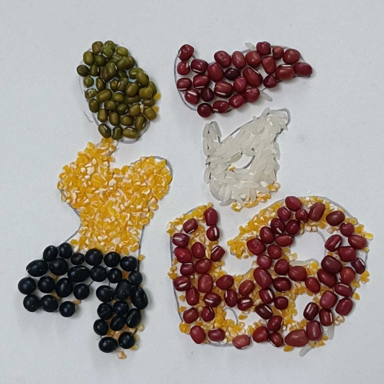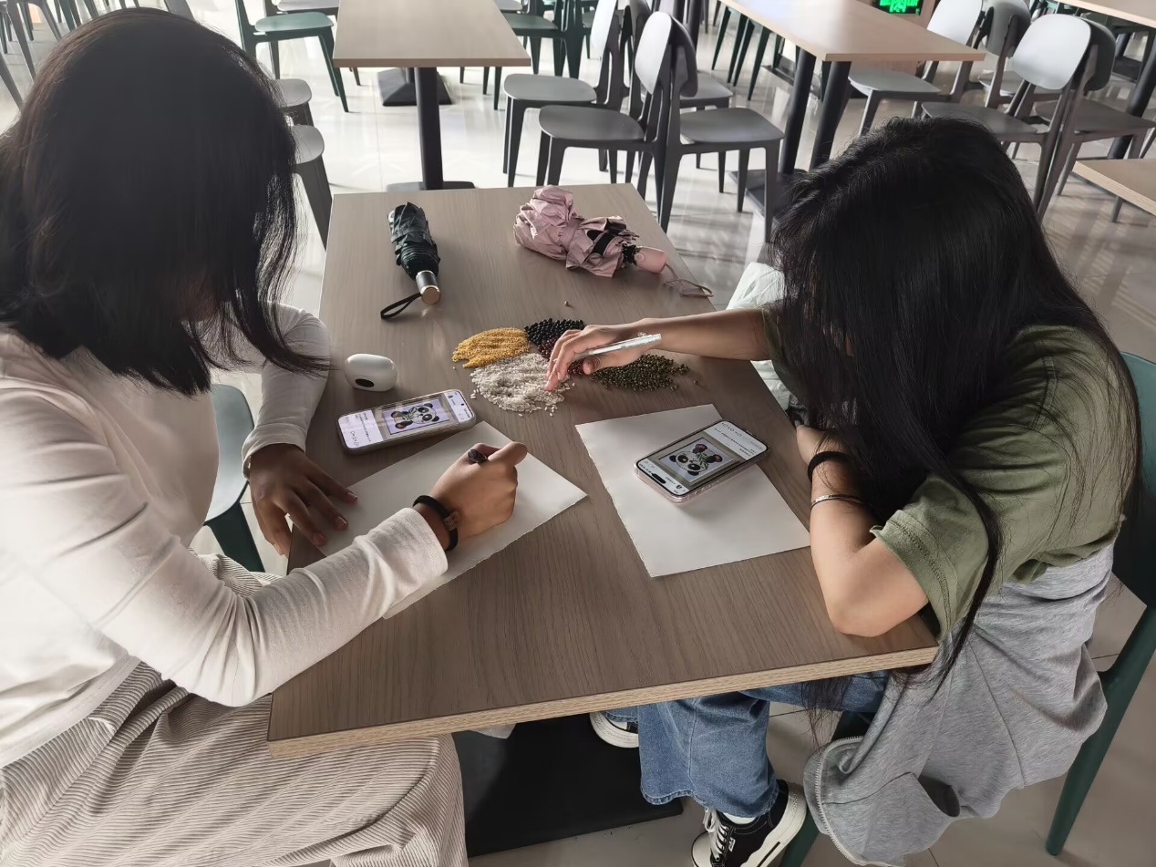 班级女生分成小组在西苑食堂创立“粮”心创意市集,集体制作五谷画,大家利用红豆、绿豆、大米等粮食,齐心协力共同制作出了精美“福”字五谷画。