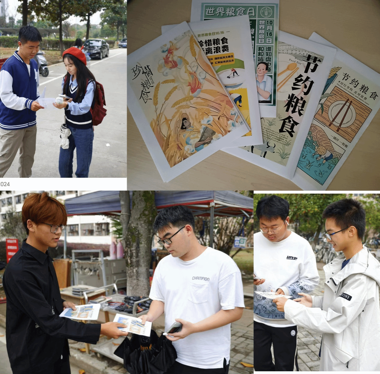 男生们则在东苑食堂附近分发宣传手册,倡导节约粮食、珍惜资源,提高大家对世界粮食日的重视,倡议大家从自身做起,为推动形成节约粮食的良好风尚贡献力量。