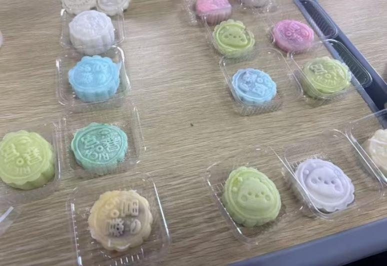 活动现场洋溢着温馨与欢乐。在生卫维权部成员的指导下,同学们分组协作,有序开展制作:将沸水缓缓倒入冰皮粉中细心搅拌,揉制成光滑柔软的面团;调入天然植物色素后,巧手分切、搓圆、包馅,最后经模具定型,一枚枚纹路精致、色彩雅致的冰皮月饼跃然呈现。整个过程中,同学们既体验了传统美食的制作技艺,又感受到亲手创作的乐趣。