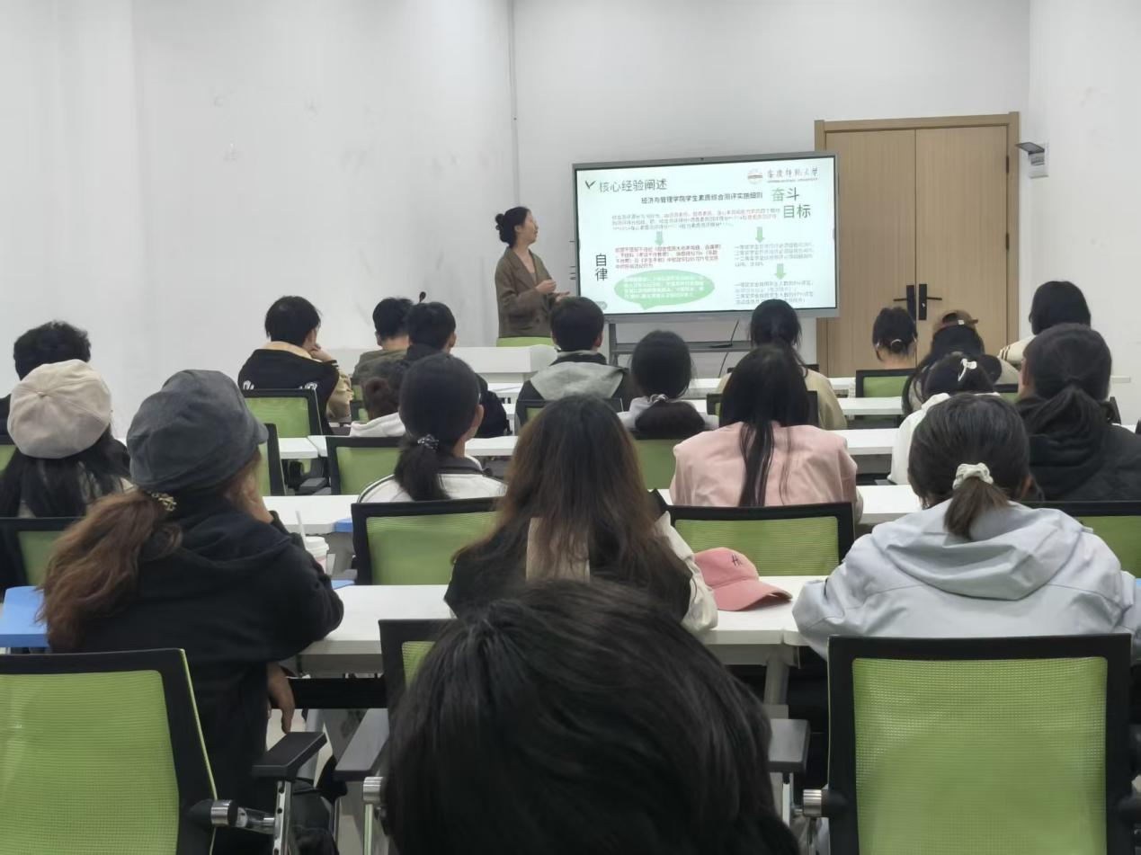 活动现场,2023级财务管理专业彭思怡同学结合个人学业与成长经历,分享了目标拆解式的学习方法以及平衡课程与竞赛的时间管理技巧;2022级物流管理专业朱婧雯同学通过具体案例,讲解了学科竞赛备赛策略和社会实践资源对接方法。两位同学的分享既包含实用方法,也融入了心灵感悟,生动诠释了德智体美劳全面发展的成长路径,引发了在场同学们的共鸣。
