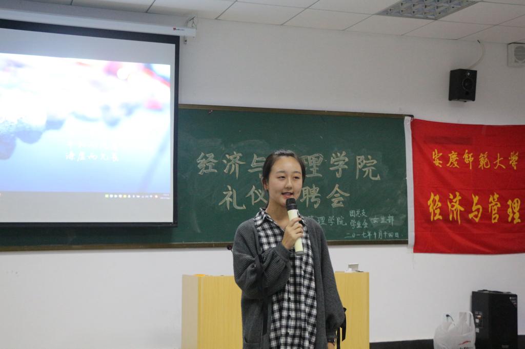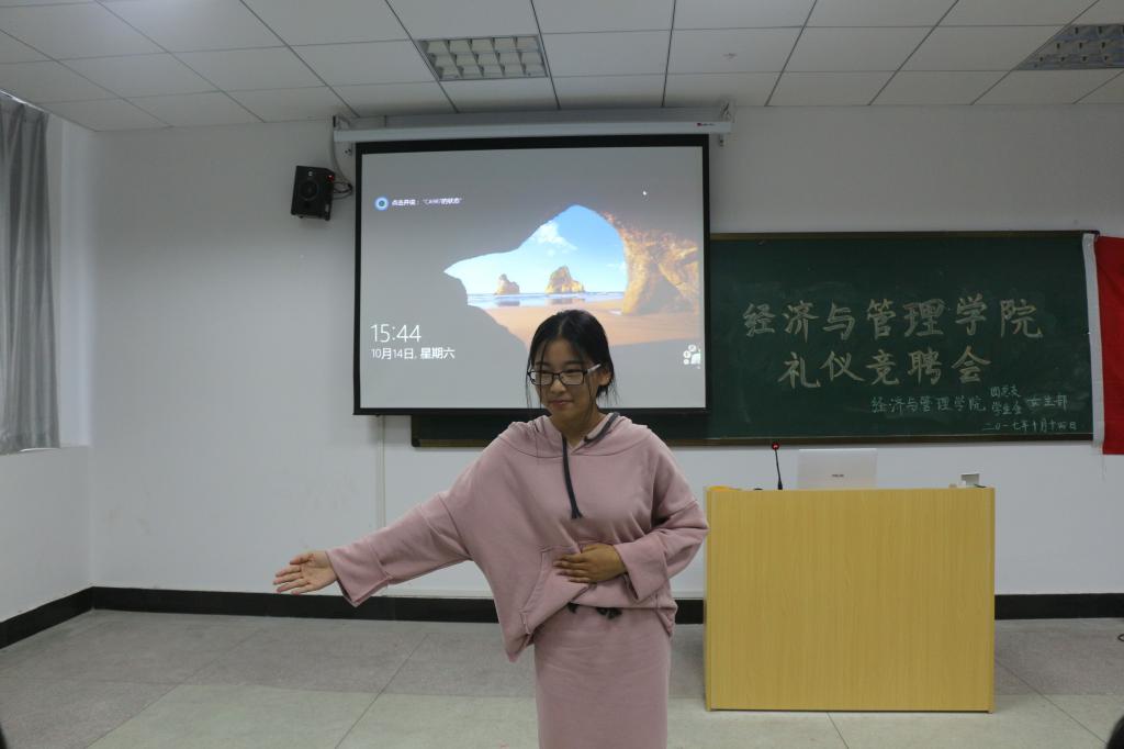 10月14日,九游体育官网在E405教室举办礼仪竞聘会。院学生会主席阚梦洁,院学生会副主席李慧、陈露、江浩,礼仪队队长徐慧君,礼仪队往届成员朱世芳出席并担任本次竞聘会评委,主持人马慧宽。