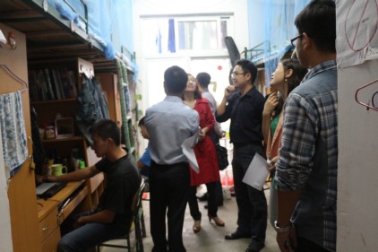 检查组首先来到10号楼女生宿舍,各个宿舍通风良好、空气清新,生活用品摆放整齐,给老师们留下了良好的印象。对多数学生宿舍明亮、整洁的环境及各种温馨、细致的安全提示,老师们给予了充分肯定和赞许。针对个别寝室乱拉网线、电线等问题,检查组老师对学生进行了及时纠正。对男生宿舍楼男生玩游戏、阳台过于脏乱等问题给予批评。对部分寝室不规范的摆放及部分寝室卫生间存在异味、光线不足等问题提出了整改意见。对检查中出现的寝室楼道严重漏水,阳台门锁丢失等问题也引起了检查组老师高度重视。最后,检查组的老师们来到大四年级宿舍楼,与毕业班的学生进行了亲切交谈,勉励同学们好好学习,珍惜学校为同学们创造的良好学习氛围,力争学有所成。