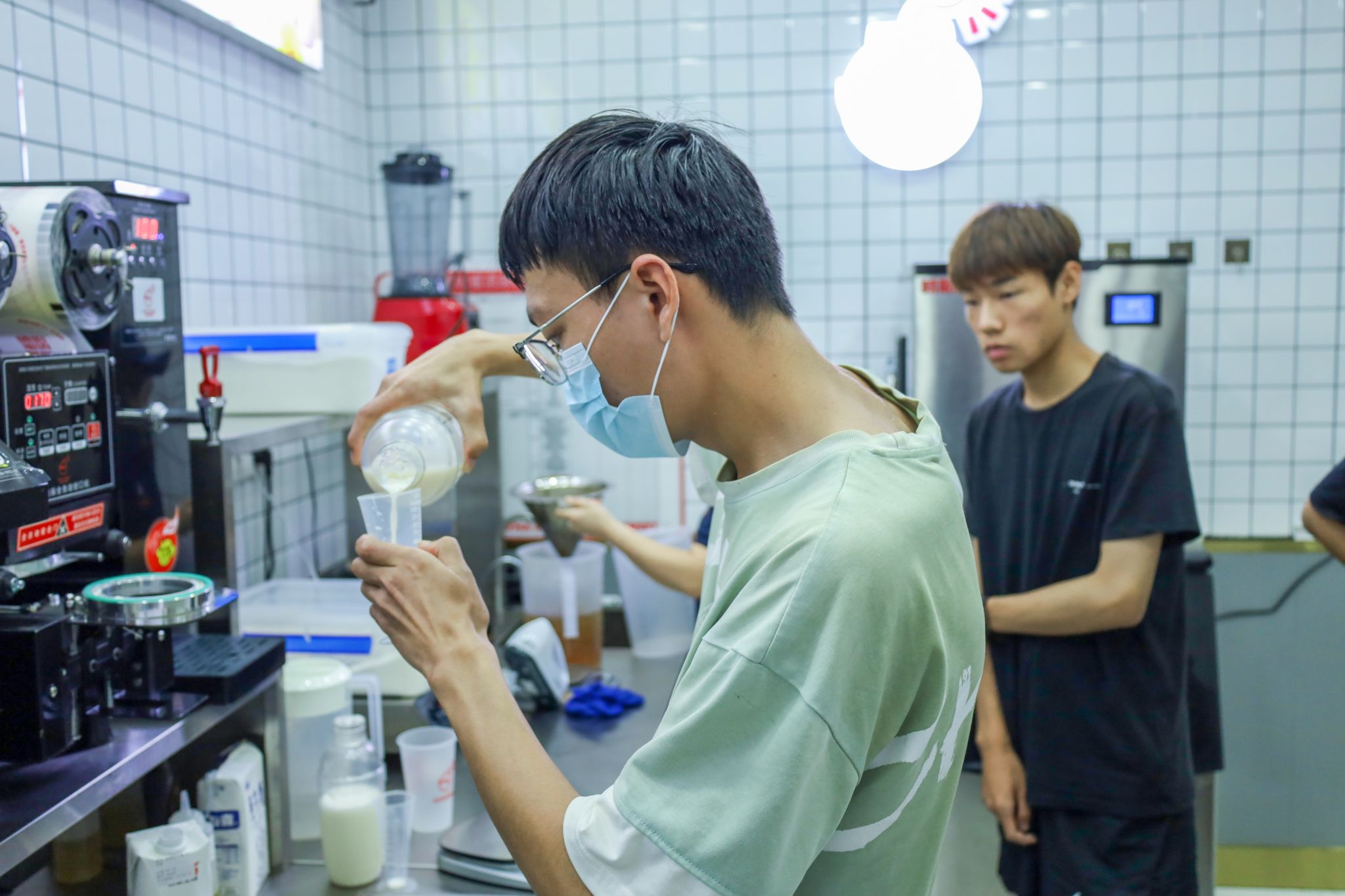 舀一勺果酱,倒入80ml牛初乳,按照个人喜好加入适量冰块,再用常温水装填……同学们全神贯注,向奶茶店工作人员请教饮品制作技巧。“制作奶茶听起来简单,真正动起手来还真不容易。”该班钟静同学在尝试制作杨枝甘露时,由于没有把握好芒果酱的添加量,导致饮品口感过甜。二次制作时,她吸取教训,使用度量杯精准把控小料的摄入,最终成功做出一杯杨枝甘露。